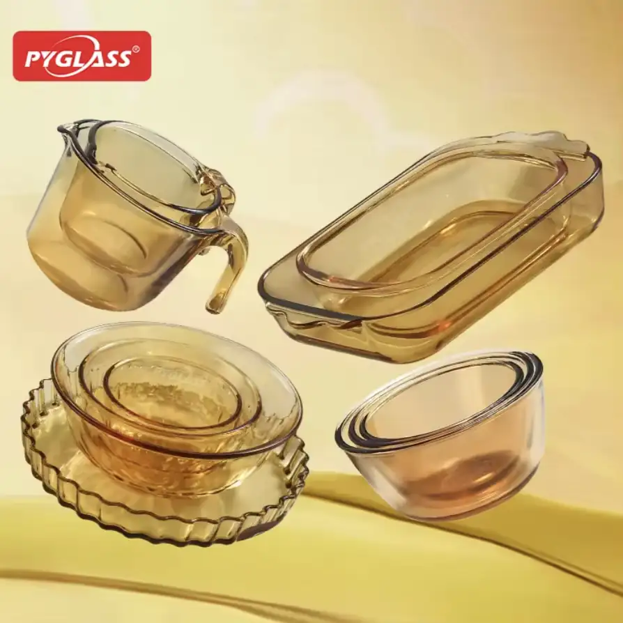 The amber glassware set includes bowls, jars, and drinkware made from durable borosilicate glass. Its warm amber hue adds elegance to any table or kitchen while ensuring food-safe, heat-resistant performance.