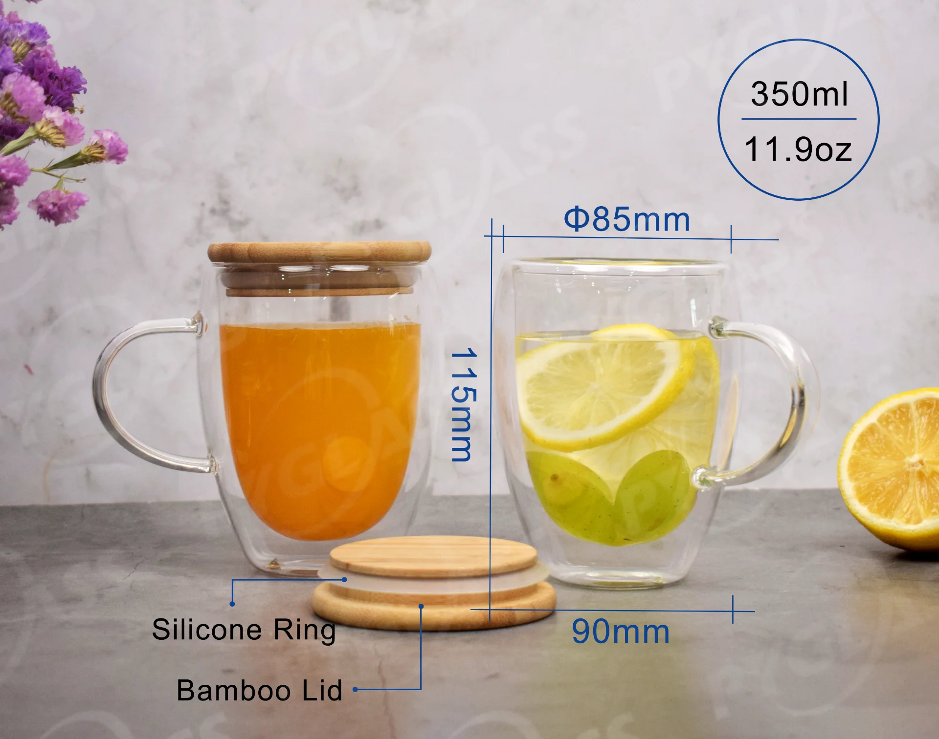 Double wall glass mugs with bamboo lids for insulation and eco-friendly design.